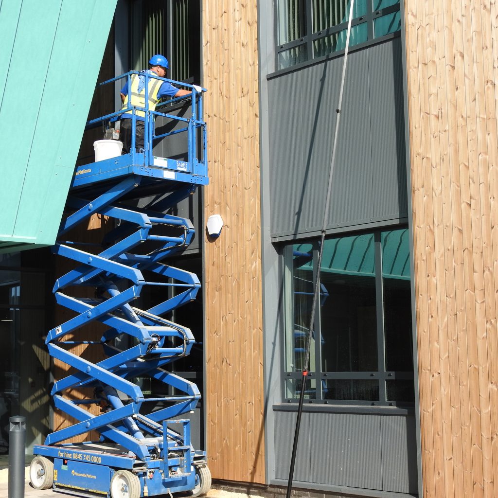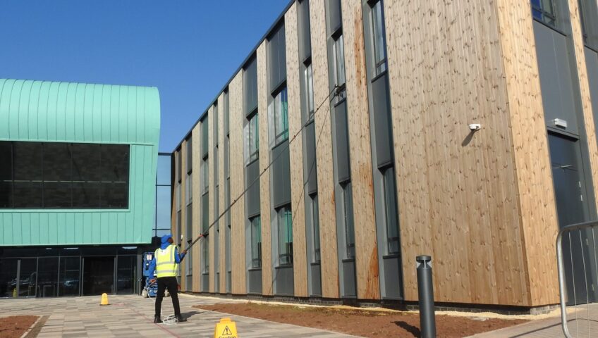 Barnwood builders done a fantastic job in building the new collage ready for the students, but after building it can be messy, so we were called in to support in cleaning the site. The windows and cladding were thick with builders dust and dried on cement which made it a complex job.