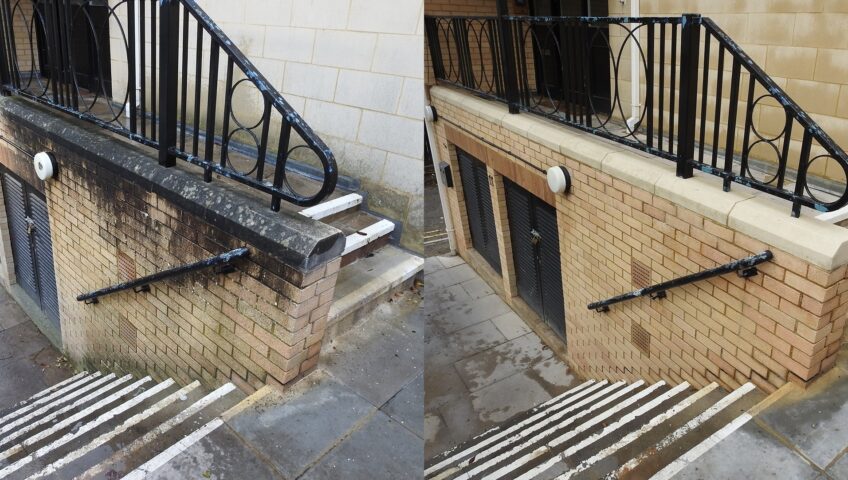 The sandstone ledges were also thick with mould, the client had a leaky gutter dripping on her porch, above her door, which was bouncing back on to her render from the splash… These splashes contain more minerals, dirt, and water for even more microorganisms to grow. This area was particularly thick with mould and algae.